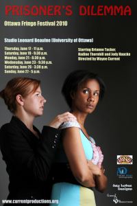 From there it was on to my last show of the evening (I was calling it an early nite to pace myself, because the older I get the more of a pussy I seem to become), THE PRISONER’S DILEMMA.  This one I’d been looking forward to, not inconsiderably because I’d become quite chummy with Director Wayne C. over the so-far short course of this year’s Fringe…a ‘fellow blogger’, swell guy, longtime friend of my Jammy, and one of the first people ever to bother reading THIS site, he paints a wise picture of himself as he goes, and I had high hopes for his show.  Afterwards, he saw me in the courtyard, zoomed in, and eagerly asked me what I’d thought.  I told him I’d really liked it.