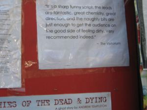Some very honourable mentioning to a few others…like Dbi Young’s amazing WORD! SOUND! POWAH!, the beautiful, brutal AFTER SHOCK, Johnnie Walker’s grand REDHEADED STEPCHILD, the Celine-centric mindfuck of BLISS, and of course my hometown heroes Emily Pearlman and Nick DiGaetano and COUNTRIES SHAPED LIKE STARS. It would have made the list but, having seen it twice before in two different venues, I can’t really think of it as a ‘Summerworks show’. You know how that goes. And also, a huge apology to all the shows I didn’t make it out to see…great sounding joints like HOMEGROWN (even after the Toronto Sun launched such an effective media campaign for it..!), MODICUM OF FREEDOM, FOSTER CHILD PLAY, POST EDEN, THEORY…sigh. Too much theatre, too little time. Oh, and of course, a huge thank you to BIOGRAPHIES OF THE DEAD AND DYING…not just for being a wicked cool show, but for legitimizing me by including one of my reviews on your sandwich board: