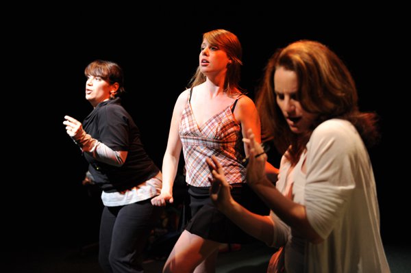 Headed on inside to the lovely wisps of fake theatrical fog I dig so much, and a minimal set in three parts, one for each of the main actresses about to take the stage. Tania Levy, Kate Smith, and Maureen Smith, all looking fabulous, and all revving on hi-octane fuel for this peppy story of a trio of Moms playing in a mother/son soccer outing. Naturally, most of the exciting stuff happens on the sidelines, and after a funky dance intro that had me smiling so much I coulda cried, the match was ON.