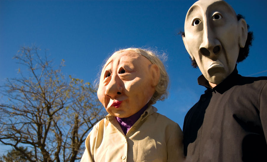 Up next was next door at Metro Studio, and one of the most buzzed-about shows on the Fringe circuit this year…and from the sold-out house, I suppose i wasn’t the only one to hear the buzzing. How nice that dialogue free shows in full face mask still sell out in this day and age. Yep, it was finally time for the Wonderheads’ GRIM AND FISCHER, by Andrew Phoenix, Kate Braidwood and Nathaniel Justiniano. Starring Phoenix as the titular grim, apparently Death himself come-a-calling, calling for one elderly Mrs.Fischer in particular, played by Braidwood. Together, they play an alternatingly cute, creepy and downright goofy cat-and-mouse game, as our Mrs.Fischer tries to outwit (or outfight) death.