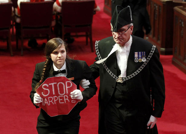 BRIGETTE DEPAPE STRIKES A THEATRICAL BLOW FOR DEMOCRACY:  Fringe heroine Brigette dePape (She Rules With Iron Stix, one of my first and fav’rit Fringe shows ever) shoved a handmade red STOP HARPER sign in Parliament’s face, protesting the policies of Emperor Steve, losing her position as page, and making National headlines all at once.  And we couldn’t be prouder.