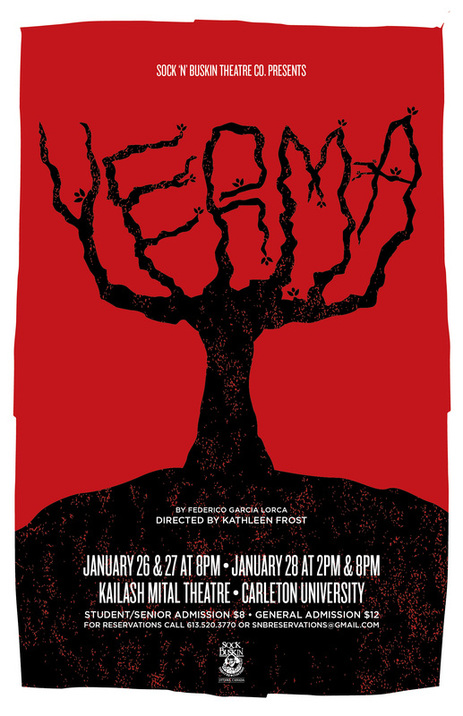 And as it happens I DO want this post up before the next show, as it’s the latest from the peppy kids at Sock’n’Buskin Theatre over Carleton U. way, and even though I keep getting lost in the tunnels on the way to the theatre, I suppose I can’t blame them for THAT. The latest show is YERMA from Federico Garcia Lorca, and directed by KAthleen Frost. Set in what seems to be rural Spain , it follows the tale of the titular character, stuck in a going nowhere marriage and desperate to have a child. On the face of it, it sounds like some by-the-numbers Katherine Heigl RomCom.