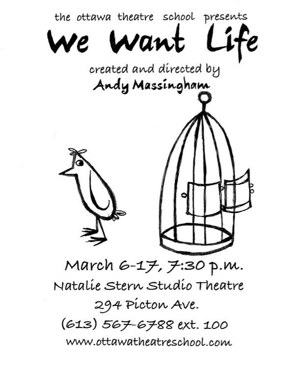 Back at my alma Mater the Ottawa School of Speech and Drama, the OTS kids are back with a new show created by Prix Rideau Awards darling Andy Massingham, WE WANT LIFE (formerly known as GREED), playing in the Natalie Stern Studio from the 6th thru 17th, and I can’t wait (fundraiser on the 1st at 8pm at the Westboro Clocktower!).