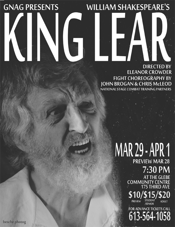 I’d never seen KING LEAR before tonite. Do ya believe that? To be honest, tho, there’s plenty of theatre classix, Shakespeare included, that I’ve never partook in…and I hear I am, taking in my first of TWO Kings Lear in almost as many months. In May, the National Arts Centre will take their stab at it, which I’m sure will be FINE and all that….but tonight the good folks at GNAG theatre (aka the Glebe Neighbourhood Activities Group, FYI) earned the right to shout FIRST! …you know, at least for this year.