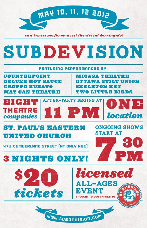 A hard night to top, I assure you. But God Damn…I can’t even think of a cute or funny intro to this one, so I’m just gonna say tonight was the premiere of SUBDEVISION, the new most amazing thing in Ottawa this side of Fringe. Taking place in St.Paul’s Eastern United Church on Cumberland at Daly, eight local theatre companies decided to get together and subvert the norm, crafting eight new pieces (between 8 and 20 minutes long) specific to different rooms in the building, and performing them several times a night. For twenty dollars, you can see one, or all of the shows, depending on your inclination (and in some cases, luck). Playing only from the 10th to the 12th, and featuring some of the most innovative, exciting, and achingly fucking beautiful live theatre you could hope for, SubDevision is a paradigm shift in local cool. My soul feels about ten times normal size after experiencing this joy of a night, and if I sound like I’m gushing, I’m not. I’m just telling it like it is.