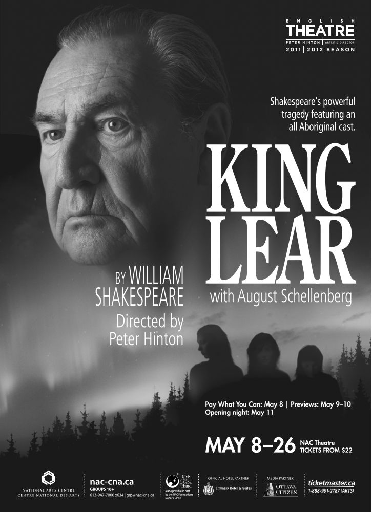 It all started on the day after SUBDEVISION, still fluttering on a joyous high from that experience. I daydreamed through my 9 to 5 drudgery, wandered down to the canal and stared at the waters a spell (something I have not done in many a moon, I have to say…it was refreshing), then headed in to Canada’s National Arts Centre for what looked to be a pretty special evening. Notwithstanding that about 4 different events were going on inside the NAC that night (several of which I wanted to catch), this night was the premiere of KING LEAR…the final piece in the current English season, and the highly anticipated all-Aboriginal casting of Shakespeare’s grand, violent epic. Also, it was ComicCon weekend, so there was a decent chance that Shatner might show up! Hey, it could happen!