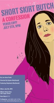 This funk-snapper came in the form of Al from Bloody Underrated over Montreal way, who hepped me to a touring show that was about to grace our city for one-night only. A former Fringe show (like the last three shows I done seen and haven’t written about…I know, SHAME! I feel it, I swear), this one a top pick of the 2011 Atlantic Fringe, SHORT SKIRT BUTCH from Halifax writer Lee Anne Poole. A one-woman show is always my cuppa tea, and a one-woman show taking place in our very own sex-shop extraordinaire Venus Envy..? Sold.