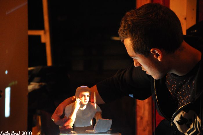 A starkly disarming piece of theatre indeed, ILIAD brings us along on a conversation between two old, distant friends…Evan, a performance artist, and Thom, who’s about to be deployed with the Armed Forces to Afghanistan.  They seem an almost ill-matched pair of friends, and the awkward tension in the air between them is palpable.  and when I say the air between them, it’s considerable…only Evan is actually present in the theatre space, while Thom is merely a projection onto a small clay figurine as the two of them share a Skype conversation.  It’s a twist that could easily just lapse into sheer gimmickry if the show weren’t so goddamned great.