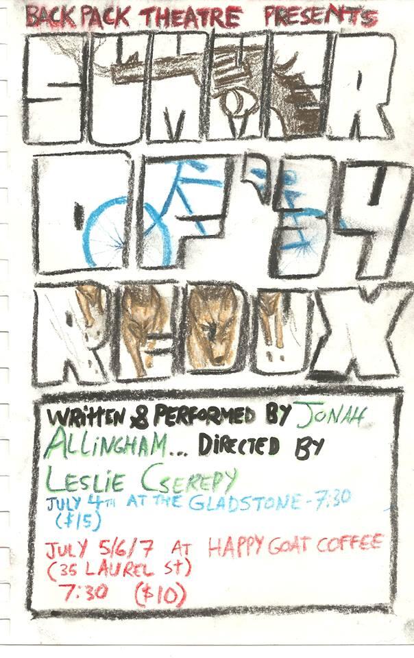 That first show was one I was pretty stoked for…Backpack Theatre’s SUMMER OF ‘34: REDUX, created and performed by Jonah Allingham, so recently my awesome co-star in our Fringe show THE TRAGICALL HISTORIE OF NICK WADE. But ‘34 is a story Jonah’s visited before, presenting the original version of this piece at the inaugural FRESH MEAT festival last year (and stay tuned for news on the 2nd installment one of these days!). He’s retooled and expanded it for this new run…after last night at the Gladstone, he’s taking it a short walk away for a three-night run at the Happy Goat Coffee Company. And if you weren’t there last night, then you should definitely plan a trip.