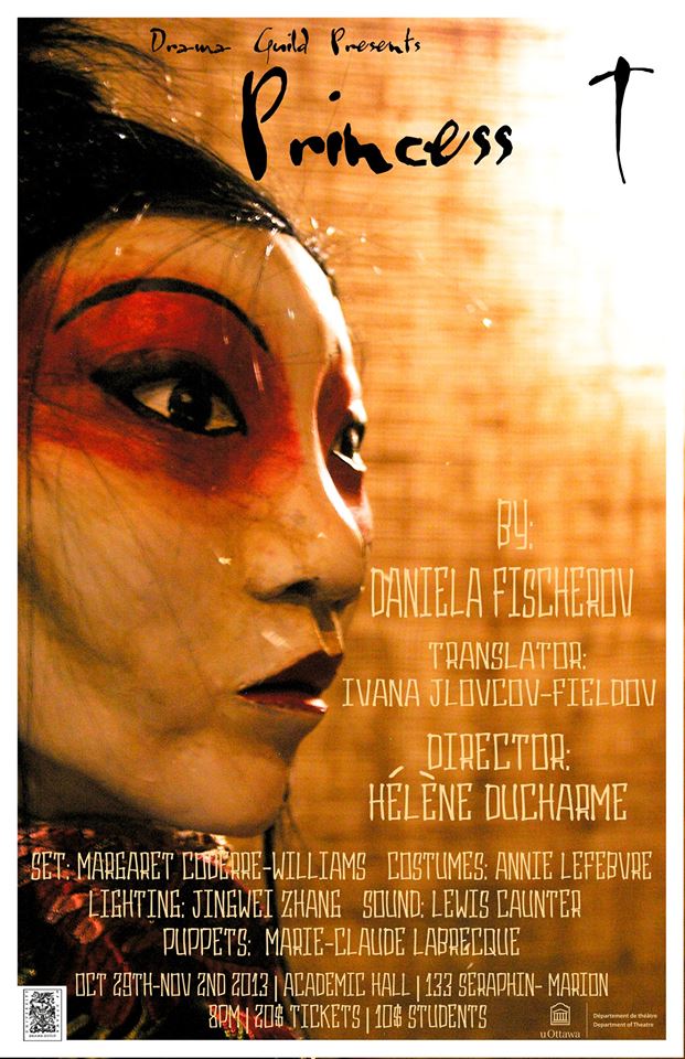 Trying to squeeze in a few minutes before school today to jot down some thoughts on the show I caught last night. While the rest of my school chums from OTS were off catching Andy Jones and gang in TARTUFFE, I found myself heading back to good old Academic Hall, for the first show of the season from the Ottawa University Drama Guild. Their latest is PRINCESS T, an adaptation of Puccini’s classic opera TURANDOT by Daniela Fischerova, translated by Ivana Jlovcov-Fieldov. Director Helene Ducharme put together a seriously impressive piece of theatre for the kids to play around in, right off the bat immersing the audience in a bit of meta-theatre (hint: you won’t be going in by the front door).