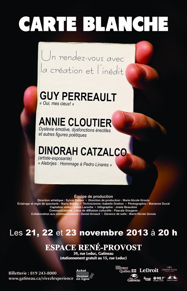 CARTE BLANCHE at Espace Rene-Prevost. New Works from Guy Perrault, Annie Cloutier and Dinorah Catzalco, from the 21st to 23rd.