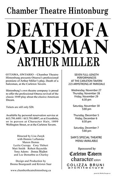 DEATH OF A SALESMAN at the Carleton Tavern, from Chamber Theatre. Willie Loman finally gets his day in Ottawa, at the venerable Carleton Tavern! A not-to-be-missed show from the 27th thru December 7th.