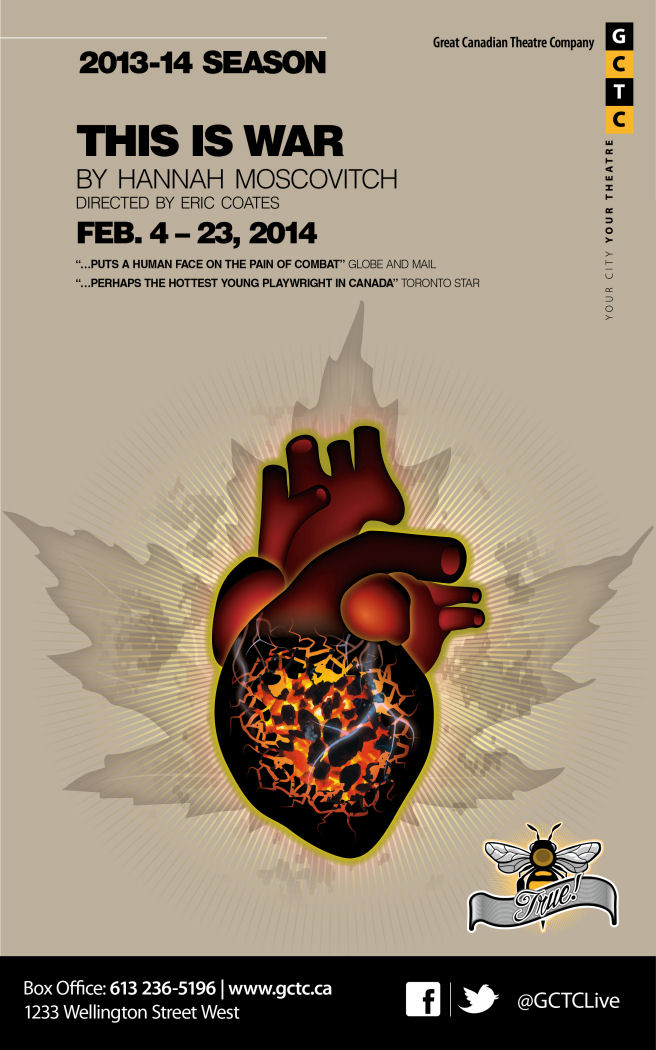 Phew! Over a week between trips to the theatre and I was starting to go a little stir-crazy over here at the Visitorium…I think Winston is starting to get sick of me hanging around, frankly. Well, okay, I have been doing some theatrical stuff in a non-reviewing capacity (details soon), but sometimes you just like to take your seat, wait for the lights to dim and see the magic happen, you dig? Which is just what me and classmate Kathryn did yesterday when the GCTC had its gala opening night for a new piece from Canuck playwright phenom Hannah Moscovitch, THIS IS WAR. Hannah’s writing had last been brought to impressive life at the Irving Greenberg with EAST OF BERLIN in 2012, and I was definitely hankering for more. And this time around, the show was being directed by none other than new GCTC Artistic Director Eric Coates himself!