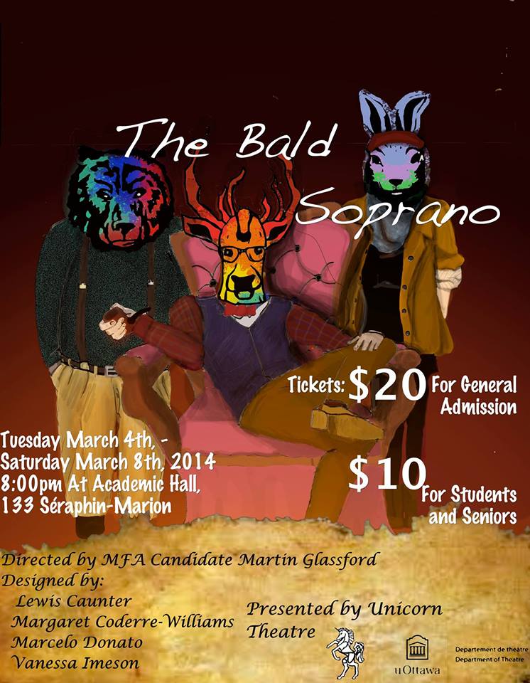 THE BALD SOPRANO at Academic Hall, from Unicorn Theatre. Martin Glassford helms this piece’o’Ionesco over at Ottawa U. From the 4th to 8th.