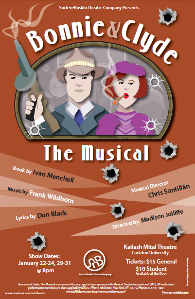 BONNIE & CLYDE: THE MUSICAL at the Kailash Mital Theatre (Carleton U.Campus), from Sock’n’Buskin. Singing and shooting, what could be better? From the 22nd to 31st.
