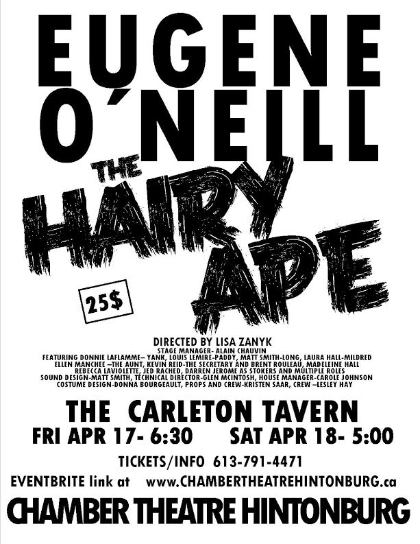 It’s been an amazing ride and I can’t believe we only have two shows left (or DO we..?). Our last couple of shows were closing in on sellouts, and we have every intention of finishing strong. The Ape is still hungry for more, so come on out and see what is genuinely one of the most unique pieces of theatre you’re going to catch in Ottawa this year. Donnie Laflamme continues to raise the bar with his powerhouse performance as Yank, practically daring the rest of us to keep up with him. How our director, Lisa Zanyk, managed to keep him and the rest of us on course for all these months is a mystery to me. Thanks to her, my castmates, our glorious crew, the Saikeley family and the Carleton staff, and of course our beloved audience. I am eternally thankful to every familiar face I see coming out to support me in this, as well as the wonderful new faces who have decided to take a chance on live theatre in unique spaces. You’re all the goods. We’ll be back at the Carleton Friday at 6:30 (double-billed that night with the amazing Rocket Rached and the Fat City 8!) and Saturday at 5 (closing night, so PARTY!), so get yer tickets now! We’re gonna pack that joint and rock your collective socks. More to come, and I’ll see you at the Theatre! Peace, love and soul,